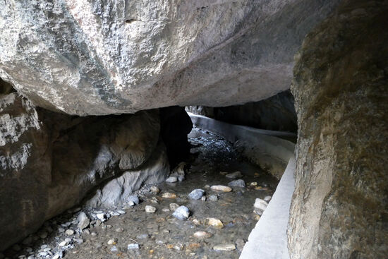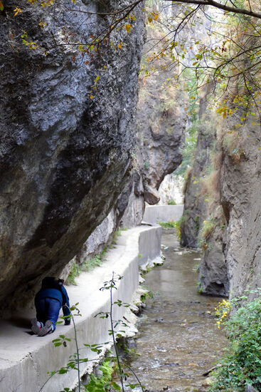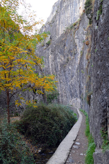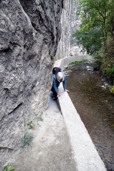 Auf der anderen Seite verändert sich der Weg. Er verläuft nun auf einer schmalen Mauer, die man an einer Seite des Río Monachil hochgezogen hat, hinter der dicke Wasserrohre verlegt waren. Vermutlich war hier früher ein Seitenkanal parallel zum Verlauf der Schlucht, wie wir es schon bei vielen anderen Wanderungen gesehen haben, jetzt zugeschüttet und zum Wanderweg umfunktioniert. Nun geht es zwar ziemlich eben weiter – von der Stelle abgesehen, wo man für 50 Meter Weg ins Flussbett hinabsteigen muss – aber an vielen Stellen ist die Mauer gar nicht breit und niedrig genug, um bequem am Fels vorbei zu kommen. Wir passieren diese Stellen also gebückt, auf den Knien rutschend oder krabbelnd, um vorwärts zu kommen. An anderen Stellen müssen wir uns rücklings weit hinauslehnen, um uns am Fels herumzuhangeln, wobei wir uns dankenswerter Weise an im Fels eingelassenen Griffen festhalten können. Wandern mit Turneinlage. Dass es zum Ende hin auch noch anfängt zu regnen, tut dem ganzen Spaß keinen Abbruch. Schließlich ist es Herbst.