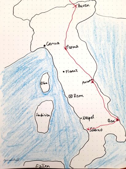 Wir reisen drei Wochen im Sommer den Stiefel runter und rauf. Über Emilia-Romagna und die Marken geht's nach Bari. Dann reisen wir weiter an die Amalfiküste und fahren über Rom in die Toskana.