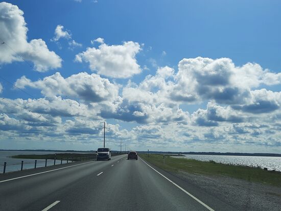 Auf der Fähre einen Capuccino und ein Blätterteig-Teilchen zugeführt, 15 min und wir waren auf der anderen Seite, erst einmal in Muhu - die Insel ist dann über einen Damm mit Saaremaa verbunden.