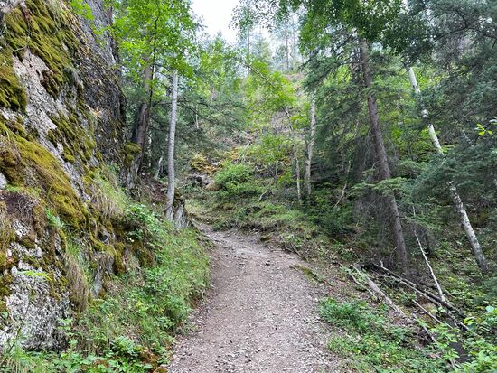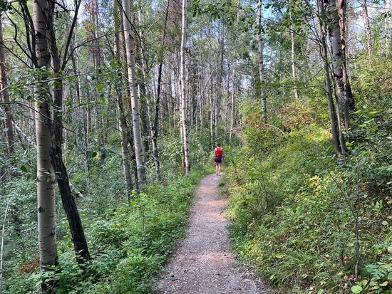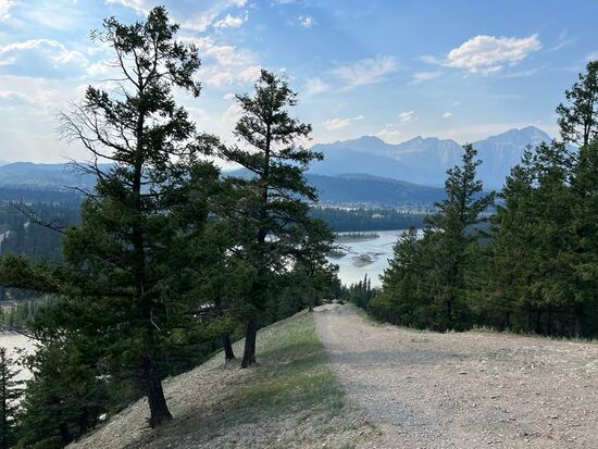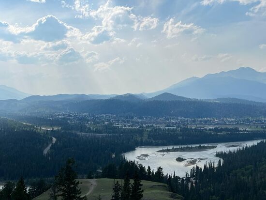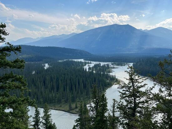 Nach dem Einchecken fuhren wir zum Old Fort Point Trail, einem Ausgangspunkt für verschiedene Wanderungen. Dort sind wir einen 4 km Rundweg gegangen, der anfangs sehr steil bergauf ging. Oben angekommen hatte man einen tollen Rundumblick und eine schöne Sicht auf Jasper. Wir sind nur am Anfang und gegen Ende der Strecke anderen Wanderern begegnet. Während der Wanderung spielten wir Handymusik und benutzten regelmäßig die Pfeife und das Horn/ Tröte. Ein bisschen komisch war uns manchmal schon zumute. Bären haben wir aber immer noch nicht gesehen. Zum Einen würden wir hier natürlich gerne mal einen sehen, zum Anderen muss das auch nicht unbedingt in direkter Nähe im Wald sein