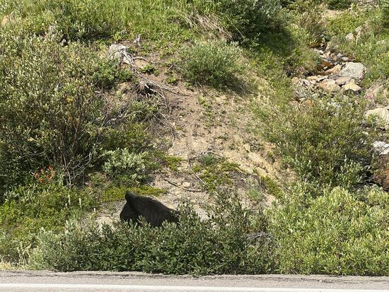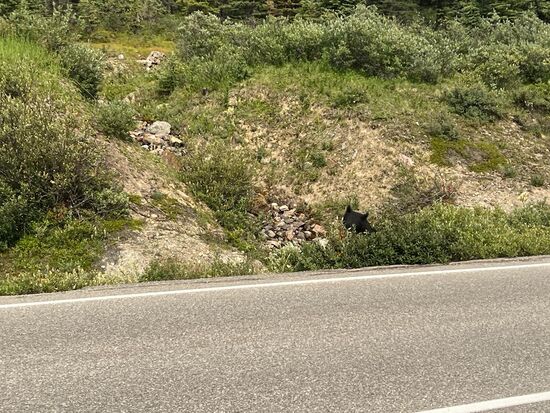 Auf unserem Weg hielten wir zuerst an den Athabasca Falls an. Dies sind 23 m hohe und recht spektakulär aussehende Wasserfälle. Nach ca. einer halben Stunde und einigen Fotos fuhren wir weiter. Nach ungefähr 100 km erreichten wir das Columbia Icefield Center. Hier kann man den Sunwapta Gletscher besichtigen. Auch hier hielten wir an und liefen über einen steilen, steinigen Weg bis zur Abzäunung vor dem Gletscher; weiter geht es nur mit einer Führung auf den Gletscher. Nach ca. einer Stunde fuhren wir weiter und hielten unterwegs an einem See, um uns einen Kaffee zu machen. Als wir vom Parkplatz losfahren, sahen wir am Straßenrand einen Schwarzbären, der hinter einem Strauch saß und fraß. Endlich, unsere erste Bärensichtung! Leider nur aus dem Auto heraus, oder zum Glück
