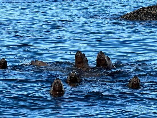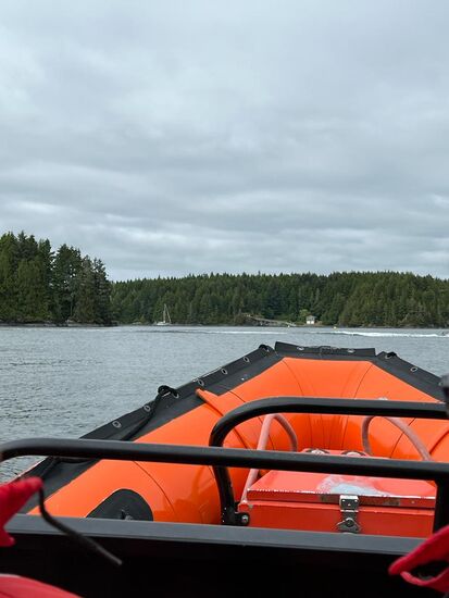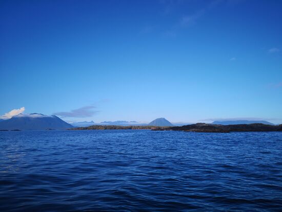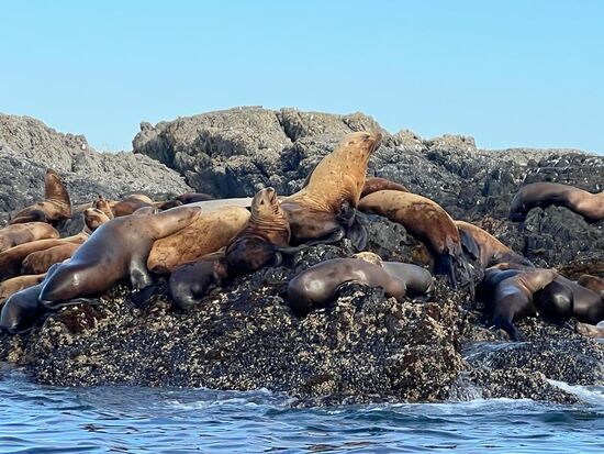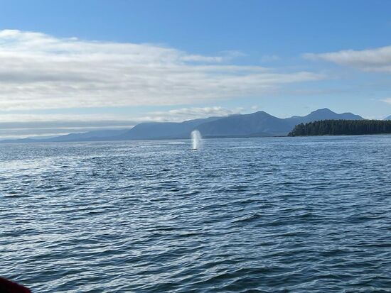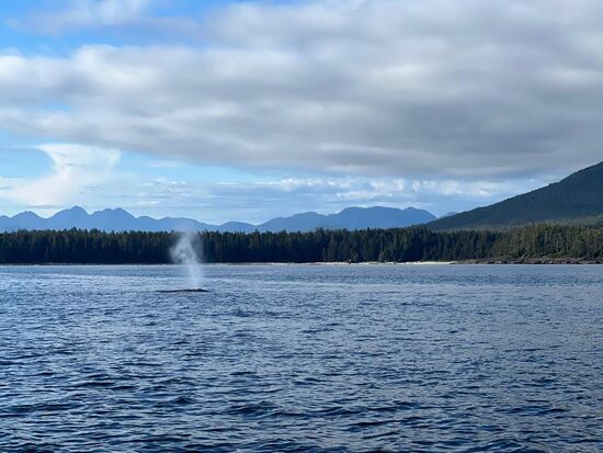 Nachdem wir heute morgen mal ausgeschlafen haben, erkundeten wir noch einmal den Ort und besuchten die kleinen, süßen Geschäfte hier. Für den Nachmittag hatten wir eine Whale watching Tour gebucht. Die Tour fand mit einem offenen Boot und noch fünf anderen Personen statt. Alle Teilnehmer mussten einen Survival Floating Suit tragen. Während wir erst durch die vielen Buchten vor Tofino fuhren, ging es anschließend raus aufs offene Meer. Nach einiger Zeit sahen wir mehrere Grauwale und etwas entfernt auch einen Buckelwal. Außerdem noch eine große Gruppe Seelöwen, die auf einer kleinen felsigen Insel lagen. Einige waren auch im Wasser, nahe an unserem Boot. Einige Seeotter haben wir auch noch gesehen.