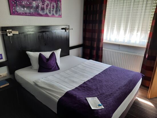 Das Wetter ist schön und auch die Strecke ist angenehmer, als es die von mir gedachte B10 gewesen wäre. Ich lasse mir unterwegs Zeit und komme gegen 16:30 beim meinem Best Western Hotel in Pirmasens an. Anders als sonst üblich befindet es sich mitten in der Stadt. Es ist nur drei Etagen hoch und hat oben eine nette Dachterrasse, die aber leider nicht bewirtschaftet ist. Abends nach 20:00 wird das Haus abgeschlossen und man muss durch den Hintereingang über den Innenhof mit einem Pin-Code rein. Im Innenhof befindet sich auch der Parkplatz. Dort habe ich meinen Roller am Rand zur Ausfahrt abgestellt. Beim Einchecken frage ich, wo ich ihn am besten abstelle. Sie Dame an der Rezeption sucht auf ihren Monitoren nach ihm und meint „da steht er doch gut.“