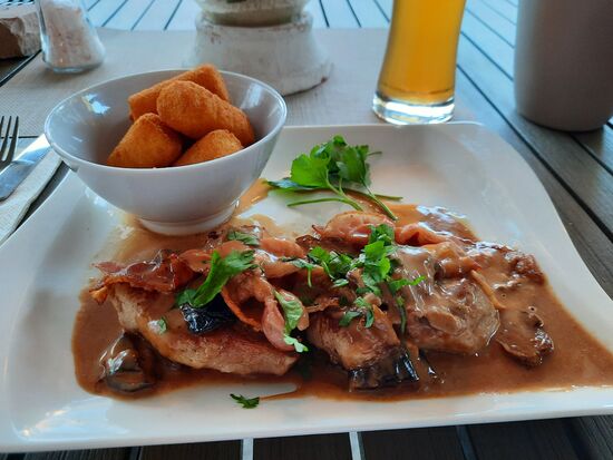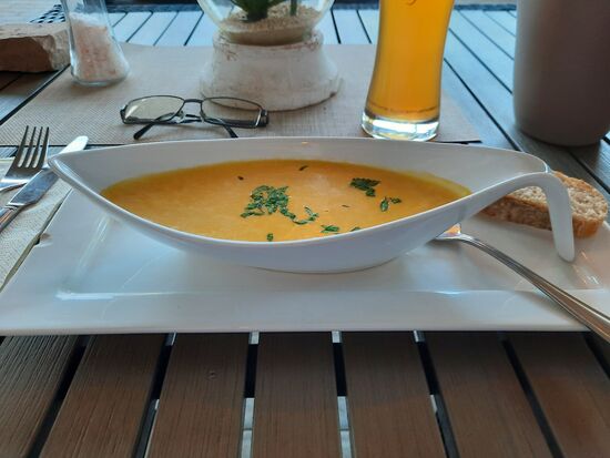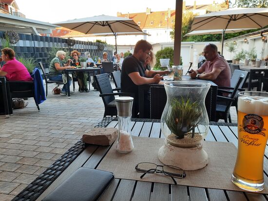 Gegen 19:00 breche ich auf. Der Aufzug ist immer noch kaputt. Woran ich nicht gedacht habe ist, dass ich durch ein Tal laufen muss, also sowohl hin, als auch zurück am Ende tüchtig bergauf muss. Aber so habe ich mein Abendessen gleich wieder verdaut. In dem Recht netten Innenhof sitzt man gemütlich und es ist ordentlich was los. Ich bestelle die Suppe des Tages, eine ganz ausgezeichnete Karotten-Ingwer-Cremesuppe und dann Schweinelendchen mit Pflaumen gefüllt, Pflaumensoße und Kroketten. Das ist glaube ich etwas typisch Pfälzisches und schmeckt lecker. Um 20:00 taucht dann plötzlich eine offensichtlich angemeldete Gruppe mit rund 20-25 Personen auf. Aber auch dann funktioniert der Service. Also eine wirklich gute Empfehlung.