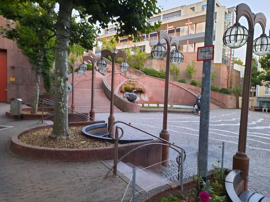 Zurück zum Hotel laufe ich etwas anders und entdecke so auch noch die Fußgängerzone. Sie ist recht hübsch gemacht, aber leidet jetzt kurz vor 21:00 absolut ausgestorben. Ein einziger Dönerladen hat geöffnet. Davor sitzen drei Leute. Auf einem zentralen Platz mit beeindruckendem Brunnen – aber ohne Wasser sitzt eine Handvoll Leute. Sonst herrscht tote Hose. Es erinnert mich an die Stuttgarter Fußgängerzone Anfang der 80er Jahre. Zum Glück hat das mit unserer Königsstraße heute nichts mehr zu tun. Im Hotel ist der Aufzug immer noch kaputt. Also noch einmal vier Stockwerke hoch, nachdem sich der Hintereingang im Untergeschoss befindet.