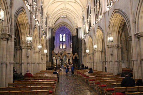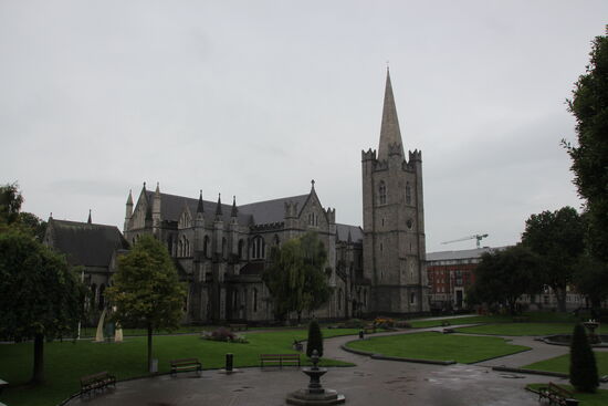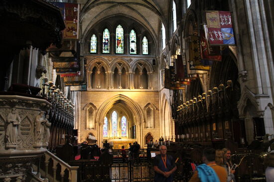 Mein nächstes Ziel ist die Christ Church Kathedrale, die vor allem durch ihren besonderen verschachtelten Baustil auffällt. Wieder nehme ich eine. Bus auf Verdacht, der in die richtige Richtung fahren könnte und lande genau richtig. Allerdings nicht bei der Christ Church, sondern bei der St. Patricks Kathedrale. Die wäre aber sowieso als nächstes dran gewesen. Diese Kirche ist die Hauptkirche von Irland. Erfreulich ist, dass hier wieder einmal mein Schwerbehindertenausweis greift. Stadt 9 € ist der Eintritt frei. Man bekommt ein Infoblatt und einen Audio Guide. Auch interessant, dass Herr Guinness Irgendwann Ende des 18. Jahrhunderts umgerechnet auf heute etwa 22 Mio. € für den Umbau der Kirche gespendet und dann den Umbau auch gleich selbst organisiert und beaufsichtigt hat. Die Kirche ist wieder einmal beeindruckend.