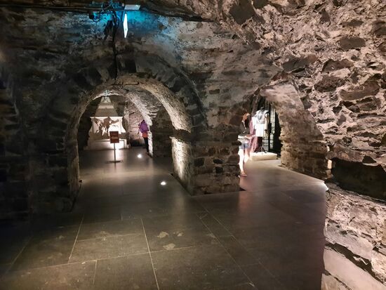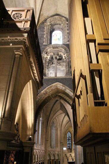 Bis ich wieder raus komme hat es zum Glück auch wieder aufgehört zu regnen. Ich laufe die Straße, die wir gestern mit dem Bus gefahren sind in entgegengesetzter Richtung und komme jetzt dann doch zur Christ Church Kathedrale, für die dann gleich über 16 € fällig wären. Aber auch hier gilt wieder – Eintritt für Schwerbehinderte kostenlos. Ich vermute, dass der Eintritt deshalb so hoch ist, weil man quasi gleich zwei Kirchen auf einmal anschauen kann und außerdem noch die Krypta. Die sollen die ältesten heute noch in Funktion befindlichen Räumlichkeiten in Irland sein. Außerdem ist hier auch ein wertvoller Domschatz ausgestellt. Ich muss aber sagen, dass mich die St. Patricks Kathedrale mehr beeindruckt hat.