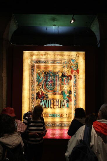 Es gibt in Dublin genau zwei Straßenbahnen und eine davon, die rote Linie startet genau bei der Bushaltestelle, an der ich ausgestiegen bin um die Ecke. Dann nutze ich doch die Gelegenheit, einmal mit der Straßenbahn zu fahren. Wo sich die beiden Linien kreuzen steige ich um und fahre Richtung Hotel zurück. Ich ruhe ich etwas aus bevor es wieder losgeht, Dieses Mal zum Book of Kells. Es ist schon erstaunlich, was für einen Zirkus um ein einzelnes Buch machen – auch wenn mich mir damit jetzt bestimmt jede Menge entrüstete Feinde mache. Immerhin ist der Andrang, Vermutlich dank der Zeitslots nicht all zu heftig. Beim Buch selbst bin ich sogar mit einem Paar nur zu dritt im Raum. Das Buch liegt in einem abgedunkelten Raum in einem Glaskasten und darf natürlich nicht fotografiert werden. Im Audioguide habe ich gehört, dass das Buch alle 6 oder 8 Wochen weitergeblättert wird, Damit nicht die gleichen Seiten immer dem Licht ausgesetzt sind. Ich vermute daher, dass es Glück ist, ob man eine „spannende“ Seite oder wie ich eine eher mal langweiligere erwischt.