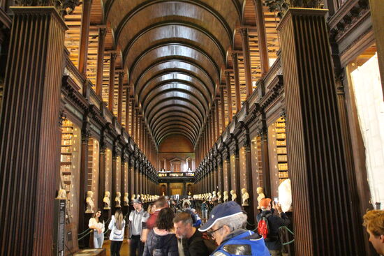 Auch der Longroom ist nicht schlecht, aber es fallen mir da auf Anhieb zwei Bibliotheken ein, die mich ehr beeindruckt haben, die Bibliothek von Kloster Beuron und vor, allem die Nationalbibliothek in Wien. Dazu kommt noch, dass der Longroom und die darin befindlichen Großprojekt aufwändigst restauriert werden sollen und zu diesem Zweck bereits die Mehrzahl der Bücher ausgeräumt und weggepackt worden sind. Nur noch in zwei Bögen stehen Bücher.