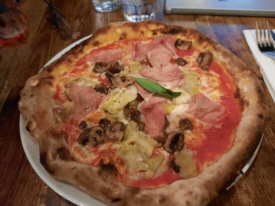 Zum Abendessen war ich heute in einer Pizzeria mit Holzofenpizza ganz in der Nähe vom Hotel. Die Pizzen fangen hier bei stolzen 13 € für eine Margerita an. Sie schmeckt nicht schlecht, aber im Teig, fehlt etwas Salz. Dadurch ist die ganze Pizza leider etwas fade.