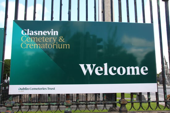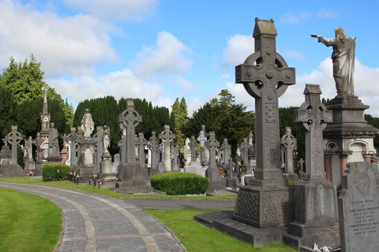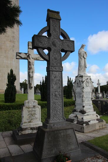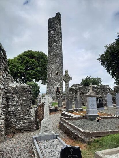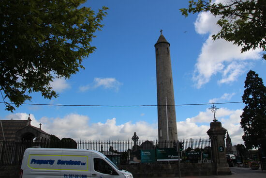 Nachdem es gestern Abend wieder geregnet hat, ist das Wetter heute erfreulicherweise wieder besser. Unterwegs möchte ich mir bei Drogetha noch einen alten Klosterfriedhof mit den größten Hochkreuzen in Irland anschauen. Bevor ich aber überhaupt aus Dublin rauskomme, entdecke ich auf rechten Seite einen überraschend neu wirkenden Rundturm. Da muss ich doch spontan halten. Es handelt sich um einen aktiven Friedhof mit schöne Grabmählern und eben diesem schönen Turm.