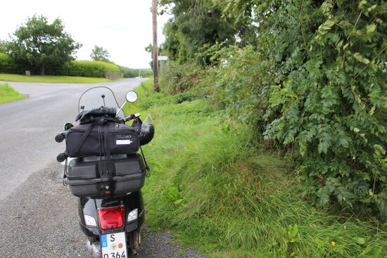 Die Strecke ist ganz nett bis es auf einmal wieder Meilen heißt. Kurz darauf sind es wieder Kilometer und wenig später wieder Meilen. Dann geht es wieder auf eine vierspurige Schnellstraße und die letzten Kilometer nach Belfast rein. Mein Ibis Hotel ist sehr modern. Alles passt soweit und es liegt sehr zentral. Da es keinen Hotelparkplatz gibt stelle ich meinen Roller einfach wieder auf den Gehweg vor eines der Fenster zum Ibis Restaurant. Jetzt wird es Zeit, nach meine. Klamotten zu schauen. Ich frage an der Rezeption nach einer Reinigung. Die nächste ist zwei Blöcke die Straße runter und rechts rein. Ich laufe erst einmal ohne Wäsche hin, finde sie auch und frage wie lange er für Waschen und Bügeln braucht. Waschen ist nicht so das Problem, aber Bügeln. Er meint aber, dass er es bis übermorgen Abend schaffen sollte. Das reicht mir. Ich lasse mir eine Tüte gegen, laufe ins Hotel und packe bis auf zwei Polo-Shorts, die Klamotten die ich anhabe und zwei Unterhosen alles ein. In der Reinigung zahle ich dann 58 Pfund, also ein kleines Vermögen, aber was solls.