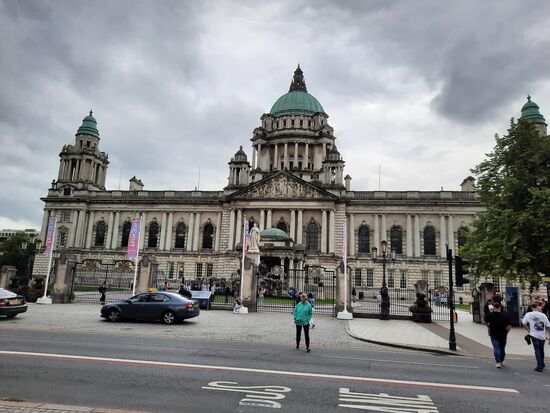 Dann geht es weiter zum zentralen Platz mit der mehr als repräsentativen City Hall. Hier halten auch alle möglichen Busse indes befindet sich auch die ziemlich große Touristeninformation hier. Bei der bekomme ich keinen Busfahrplan, der sich aber leider schlecht entziffern lässt und kaufe eine Belfast Card für 6,50 Pfund, mit der ich 24 Stunden die Busse fahren kann und bei verschiedenen Museen vergünstigten Eintritt erhalten. Die Karte gilt ab dem Zeitpunkt zu dem ich sie in einem Bus das erste Mal einsetze.