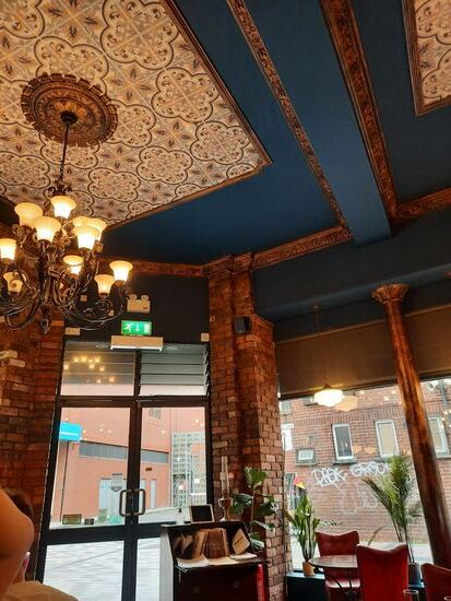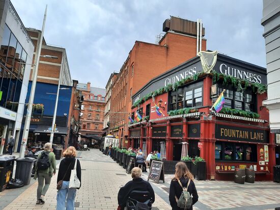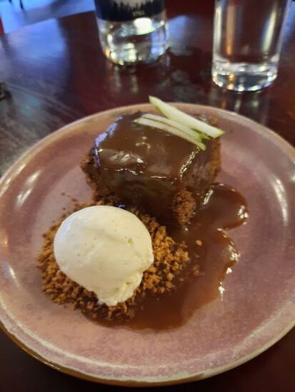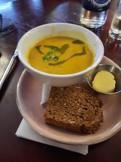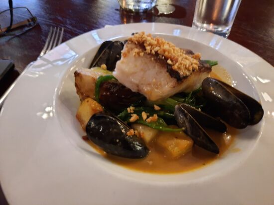 Zum Abendessen möchte ich in die Mourne Fish Bar gehen, die in meinen beiden Handbüchern und auch im Internet empfohlen wird. Leider ist kein einziger Platz frei. Auch für morgen gibt es nur zum Mittagessen oder ab 21:00 einem Platz, aber das ist selbst mir zu spät. Also reserviere ich für übermorgen einen Platz. Unschlüssig laufe ich um den Block und lande dann in der auch recht gut gefüllten Bank SQ Brasserie, wo Ich gerade noch einen Platz bekomme. So wie ich das hier einschätze, handelt es sich um eine junge, sehr ambitionierte Truppe. Die Kellner sind top und das Essen ebenfalls. Da darf es dann auch einmal etwas teurer werden. Beim Trinken beschränke ich mich auf Wasser. Ich nehme erst eine Koriandersuppe die eine ordentliche Schärfe hat und fantastisch schmeckt. Dann ein Massaman Curry. Das scheint hier, in Irland übrigens recht beliebt zu sein und findet sich häufig auf Speisekarten eigentlich irischer Lokale wieder. Hier haben sie sich aber ziemlich ausgetobt mit karamellisierten Zwiebeln, Miesmuscheln und obendrauf ein wunderbar gebratener Kabeljau mit eine, Nusscrumble. Hier war ich nach der Suppe überrascht, wie mild es war. Das sage ich auch dem Kellner als er fragt und er meint, er würde es auch lieber schärfer mögen, aber dann wäre es den meisten Kunden zu scharf. Unabhängig davon hat es aber auch wunderbar geschmeckt. Zum Nachtisch habe ich noch einem Espresso und Toffee Pudding, der eher an einen sehr cremigen Kuchen erinnert mit Caramelsoße darüber und etwas Eis dazu genommen. Wenn man irgendwo Nachtisch bekommt steht der fast immer auch mit auf der Karte. Für den habe ich echt mein letztes Wasser noch gebraucht. Der hat mit jedem Löffel den Mund komplett verklebt. Aber er war auch wieder lecker.