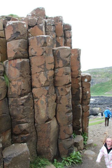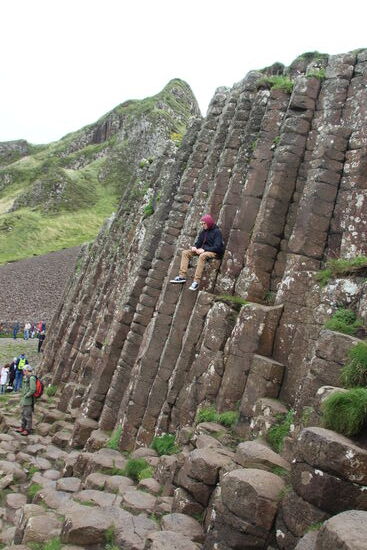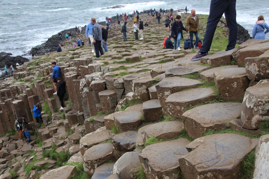 Vom Parkplatz am Giant Causeway geht es erst noch 1-2 Kilometer nach unten, weil sich die Gesteinsformationen auf Meereshöre befinden und das Besucherzentrum auf Klippenhöhe. Unser Guide hat uns den Tipp gegeben, dass wir nicht in das Besucherzentrum müssen, weil das relativ teuer ist, aber die eigentlichen Formationen keinen Eintritt kosten. Während wir so den Berg herunterlaufen überlege ich mir, dass wir das ganze später auch wieder rauf müssen. Ich sehe zwei Busse die Gasse runterfahren und frage mich, ob das ein Service vom Besucherzentrum ist. Unten angekommen bin ich zuerst etwas enttäuscht. Nach den Fotos, die ich so kenne, hätte ich mehr erwartet. Es handelt sich nur um ein eher kleines Gebiet vielleicht 50 Meter die Küste entlang. Der größte Teil davon sind die Steine auch nur recht flach. Lediglich an einer kleinen Stelle sind sie ziemlich hoch und beeindruckend.
