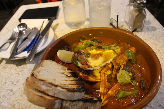 Heute ist zum Abendessen die Mourne Seafood Bar dran. Pünktlich um 20:00 bin ich da und bekomme einen kleinen Tisch im auch wieder ziemlich vollen Lokal. Es ist allerdings auch nicht sehr groß. Ich wähle zur Vorspeise noch einmal eine Seafood Chowder, die mich aber auch wieder nicht so wirklich überzeugt. Zum Hauptgang entscheide ich mich für die „Mourne Seafood Casserole Special, die in einem Extra Kasten steht und wohl so etwas wie des Signatur Dish des Restaurants ist. Ich weiß nicht, ob es an mir liegt oder, dass meine Erwartungen zu hoch waren, auf jeden Fall bin ich auch hier enttäuscht. Die Krebsarme für die die Krebszangen als Werkzeug dazu gereicht werden, sind so klein, dass fast nichts Essbares enthalten ist. Die Muscheln sind ok und die Fischstücke sind auch in Ordnung, mehr aber nicht. Das Ganze schwimmt in einer eher seeeeehr dezent gewürzten Tomatensoße, was bedeutet, dass man beim Essen die ganze Zeit die Soße an den Fingern hat. Das dazu gereichte geröstete Sauerteigbrot liegt schräg auf dem Schüsselrand und hängt halb in der Soße. Dadurch ist die Hälfte aufgeweicht. Also ich muss hier nicht mehr unbedingt her. Dabei hatte ich mir im Vorfeld schon gedacht, dass ich heute gleich noch einmal für morgen reserviere. Das lasse ich dann doch lieber.