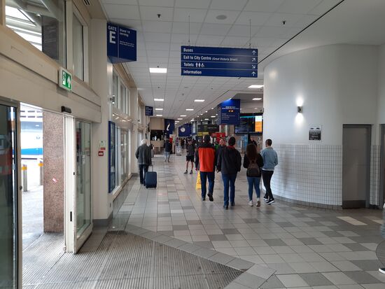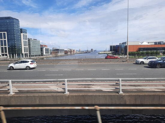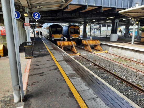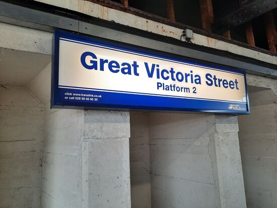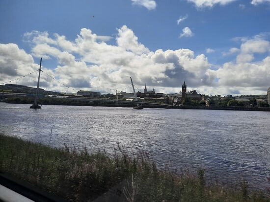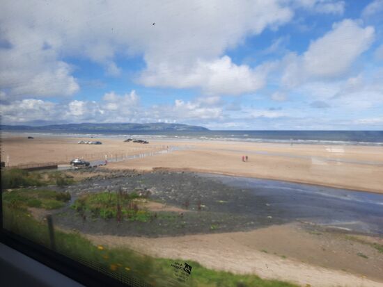 Also zurück zum Hotel alles eingepackt und kurz vor 12:00, also sogar noch ganz regulär ausgecheckt. Kurz nach 12:00 war ich am Bahnhof und habe dort ebenfalls den regulären nächsten Zug erwischt. Erfreulicherweise hatte ich eine vierer Sitzgruppe für mich so, dass ich meine Beine ausstrecken konnte. Erst sind wir fast eine dreiviertel Stunde in Belfast einmal im Kreis herumgefahren und haben S-Bahn mäßig an diversen Haltestellen angehalten. Kurz vor Londonderry führte die Strecke eine kurze Zeit direkt am Meer entlang. Das war sehr schön und ich war ganz überrascht was für schöne Strände es hier gibt. Jetzt müsste sich nur noch das Wetter auch zum Baden eignen.