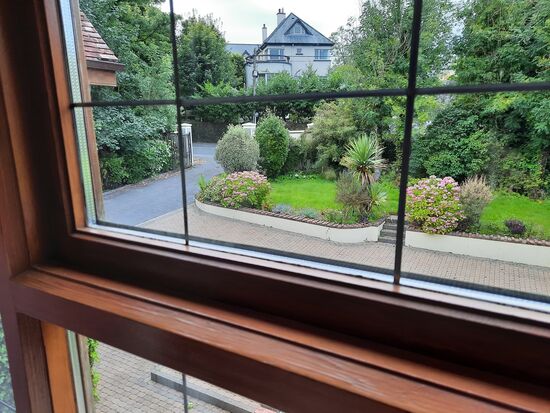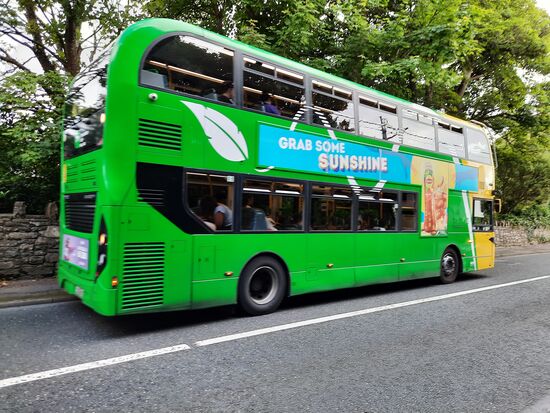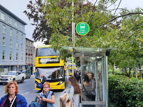 Auspacken muss ich für die eine Nacht nicht viel. Also ziehe ich gleich los. An der Bushaltestelle sehe ich, dass der Bus zumindest abends noch einmal pro Stunde fährt. Ich muss mir für die Heimfahrt also gut merken, wann der Bus zurückfährt. Ich versuche mir auch den Weg zu merken, den er fährt, aber der Bus fährt leide nicht auf dem direkten Weg, sondern macht diverse Umwege. Das wird also auch nichts. Zum Glück befindet sich wenige Meter vor meiner Unterkunft die Einfahrt zum Ardilaun Hotel. Das kann ich mir merken und ist hoffentlich etwas, was der Busfahrer auch kennt. Beim Aussteigen frage ich noch, wo die Haltestelle für die Rückfahrt ist. Die befindet sich auch hier am zentralen Eyre Square.