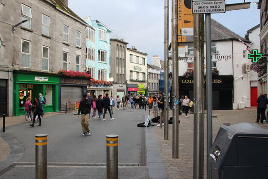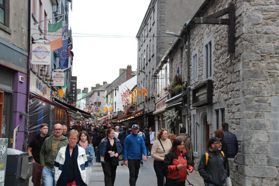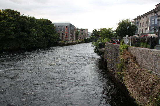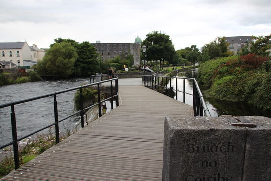 Am anderen Ende des Platzes ist auch der große Busbahnhof. Also alles recht nah beieinander. Mit OsmAnd orientiere ich mich um zum Fluss und dem Ausgehviertel auf der anderen Seite zu kommen. Dabei lande ich erst einmal in der Quay Street, einer kleinen aber langen Fußgängerzone, dem sogenannten Latin Quater. Hier reihen sich die Kneipen und Pubs aneinander, dass es eine Freude ist. Auch wenn das alles ziemlich touristisch wirkt, macht es richtig Spaß, hier zu flanieren. Sehr schön ist auch, dass alle paar Meter andere Straßenkünstler auftreten. Auch der Fluss Corrib, der die Stadt teilt gefällt mir. Ich kann mich nicht erinnern, schon einmal einen so wilden Fluss in einer Stadt gesehen zu haben.