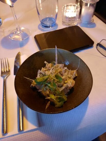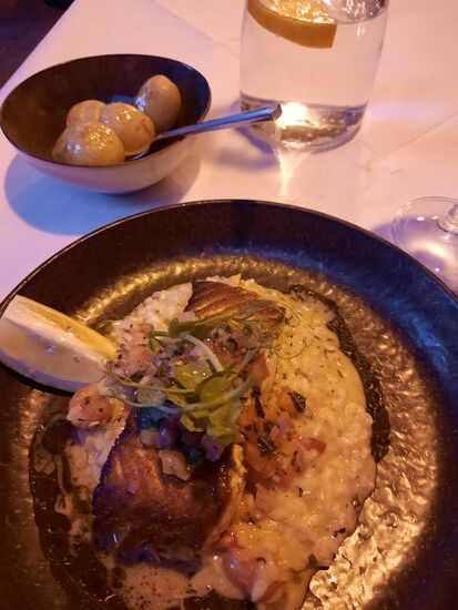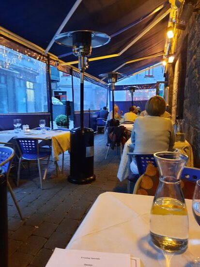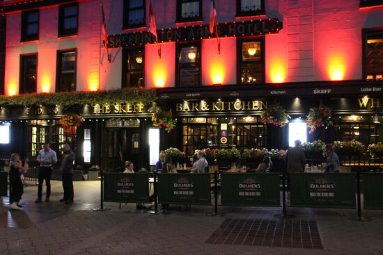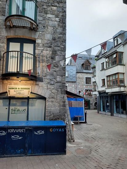 Das von meinem Lonely Planet so hoch gelobte Ausgehviertel auf der anderen Flussseite finde ich dann allerdings eher etwas enttäuschend. Nur eine Kneipe scheint echt angesagt, aber da stehen auch prompt lange Schlangen und ohne Reservierung kommt man gar nicht rein. Also schlendere ich wieder zurück in das Latin Quater. Direkt in der Hauptgasse ist alles ziemlich voll. Weil ich ja immer neugierig bin, verschlägt es mich in eine der winzigen Nebengassen, die hier links und rechts abzweigen. So lande ich beim „The Seafood Bar at Kirwans“. Das sieht recht nobel und auch nicht gerade billig aus, ist mir aber egal. Ich habe Lust auf Fisch oder Seafood. Selbst in diesem abgelegenen Lokal habe ich Glück, dass ich noch ein Tischchen bekomme, und das auch nur außen. Immerhin kommt es mir nach den Tagen in Nordirland selbst jetzt am Abend noch recht angenehm mild vor. Ich bestelle mir zuerst ein Atlantic Salmon Tatar für 16 €. Das ist für mich ungewohnt angemacht, schmeckt aber gut. Anschließend ein im Ofen gebackenen Lachs mit Risotto für 31 €. Von dem bin ich allerdings doch leicht enttäuscht. Der Lachs ist komplett durchgebacken und dadurch trocken und das Risotto schwimmt im Öl. Was ich gar nicht verstehe sind die Kartoffeln, die mir der Kellner gleich darauf auch noch als Beilage bringt. Ich frage „Kartoffeln als Beilage zu Risotto?“ „Ja, warum nicht?“ ist die Antwort.