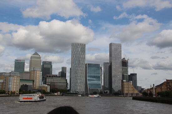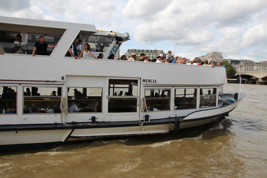 Spontan entschließe ich mich, die komplette Rundfahrt zu buchen. Als „Senior“ zahle ich etwa 15 Pfund und sie dauert ca. 90 Minuten. Schon nach knapp 10 Minuten kommt das Schiff. Auch das ist wieder so voll, dass ich erst einmal stehe. Bei jeder Anlegestelle aber kann ich einen besseren Platz ergattern, so dass ich beim Wendepunkt in Greenwich dann ganz vorne im Boot sitze und eine prima Sicht habe.