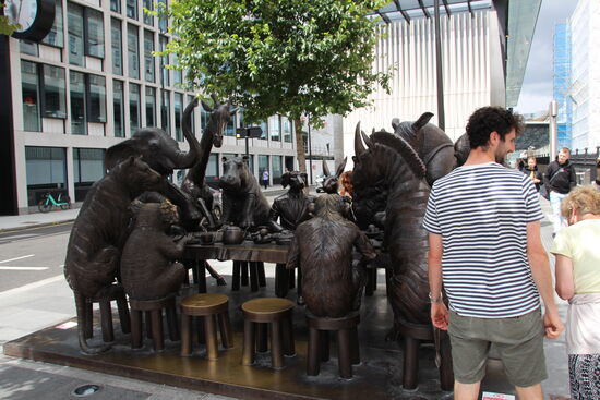 Heute ist wieder so ein durchwachsener Tag. Mal regnet es, dann ist es wieder trocken. Ich habe gelesen, dass man am Paddington Station ganz nett essen können soll mit Ausblick auf den Bahnhofstrubel. Unter anderem auch japanisch. Zuerst muss ich aber meine Oystercard, also die Fahrkarte für den Londoner öffentlichen Nahverkehr noch einmal aufladen. Obwohl ich am ersten Abend 30 Pfund gezahlt habe (wovon, wenn ich das richtig gelesen habe alleine 7 Kaution sind), und am Sonntag eine Tageskarte gekauft habe, habe ich nur noch etwas mehr als fünf Pfund drauf. Also zahle ich noch einmal 10 Pfund. Paddington Station entpuppt sich dann aber bei weitem als nicht so spannend wie gedacht. Dafür gibt es draußen vor dem Bahnhof ein lustiges, echt sehenswertes Denkmal, das diverse Fotografen anlockt. Außerdem befindet sich hier auch eine Haltestelle der noch ganz neue. Elizabeth Line. Die Eröffnung der neuen Metro Linie habe ich erst vor wenigen Jahren im Fernsehen mitbekommen.