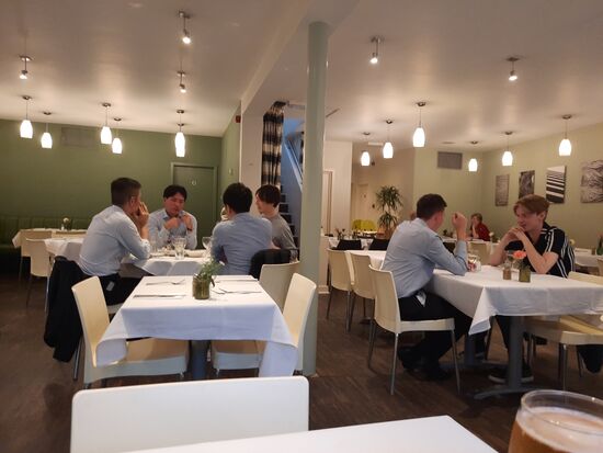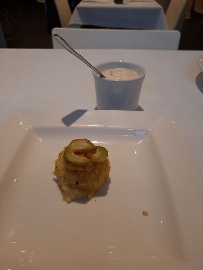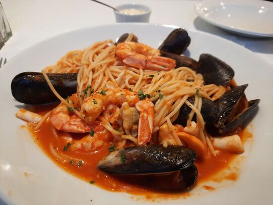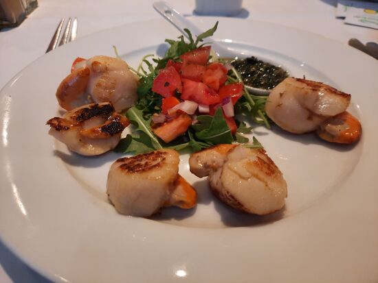 Als Gruß des Hauses gibt es ein kleines Fisch-Kartoffel Küchlein. Dann habe ich gebratene Jakobsmuscheln bestellt und anschließend Meeresfrüchte Pasta, die heute auf der Tageskarte stehen. Alles war wieder ausgezeichnet und so viel, dass ich es nicht geschafft habe. Die Meeresfrüchte Pasta trägt ihren Namen zu Recht. Jede Menge sehr große Miesmuscheln, reichlich große Scampi, Tintenfischstreifen und sogar noch eine Jakobsmusche. Dazu ein Bier und danach ein Espresso habe ich knapp 40 Pfund gezahlt.