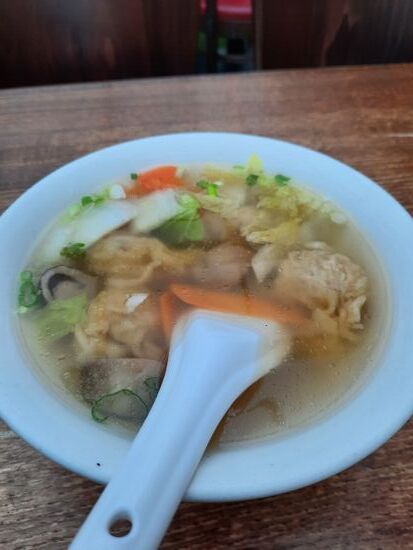 Am Ende habe ich mich dann zum Abendessen für einen Kanton Chinesen entschieden, weil der eine umfangreiche Dim Sum Karte hat, aber dann doch Wan Tan Suppe und gebratene Nudeln mit Krebsfleisch gegessen. Das hat sehr schlicht ausgesehen, Dafür aber lecker geschmeckt und war sehr reichlich.