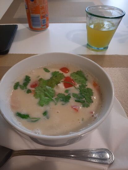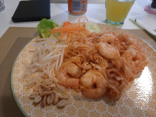 Tatsächlich ist das kleine Lokal voll als ich wiederkomme. Ich bekomme den letzten kleinen Tisch. Das Essen schmeckt aber in der Tat ausgezeichnet. Ich nehme eine Tom Ka Gai und dann Pad Thai Gung. Zusammen mit einer Dose Fanta zahle ich gerade einmal 17,80 Pfund.