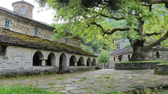 Ein reichliches Frühstück mit viel griechischem Gebäck erwartet die 4 Gäste des Hauses. Der kurze Rundgang durch das Dorf bietet uns eine Ansammlung aus mit Schieferplatten gedeckten Steinhäusern mit einem idyllischen kleinen Dorfplatz und einer uralten Platane. Leider stehen einige Häuser leer und sind dem Verfall preisgegeben.