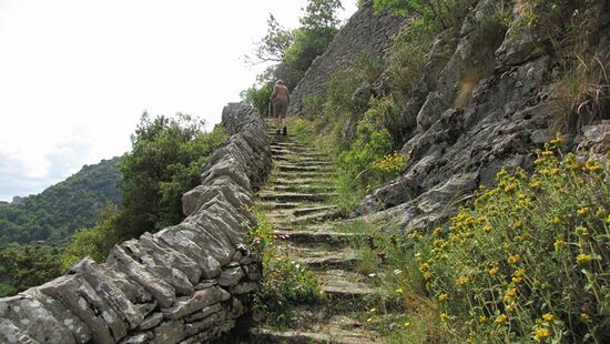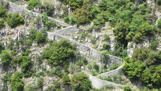 Nach einem kräftigen Gewitter (wir waren gerade wieder im Hotel) kommt die Sonne wieder heraus und wir fahren Richtung Vradeto zur „Skala“. Dieser Treppenweg führt aus dem Tal nach Vradeto und überwindet dabei ca. 700m. Unglaublich, was sich da am gegenüberliegenden Hang den Berg hinaufzieht. Wir wollen wenigstens ein Stück des Wegs gehen, um zumindest einen Eindruck zu bekommen. Erst geht es ins Tal hinunter, über zwei alte Steinbrücken hinweg um dann den Hang zu erklimmen. Der Weg ist gepflastert und mit niedrigen Stufen versehen. Er lässt sich erstaunlich gut gehen. Es blüht und grünt aus allen Ecken und Ritzen. Sogar einige Wildkräuter wie Thymian und viel blauer Salbei verströmen ihren Duft. Es treibt uns immer höher. Nach ca. 1/3 der Höhe kehren wir wieder um, da es sonst zu spät wird.
