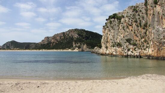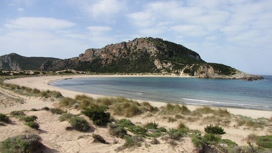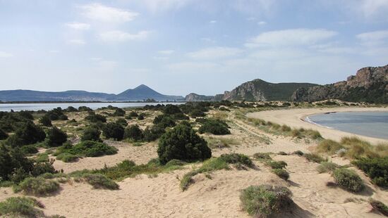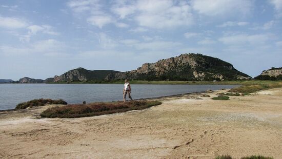 Auf Empfehlung unserer Empfangsdame beginnen wir die heutige Tour mit einem Zwischenstopp an der Lagune bei Pylos. Von den vielen Wasservögeln, die hier überwintern, sind sogar noch einige Flamingos von Ferne zu entdecken. Die Überraschung erwartet uns beim Überklettern der Dünen: eine wunderschöne Bucht mit feinem sauberen Sandstrand und nur 8 Menschen. Traumhaft! Unser erstes Highlight!