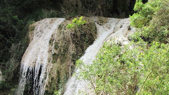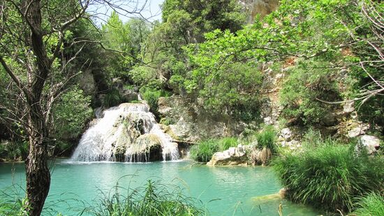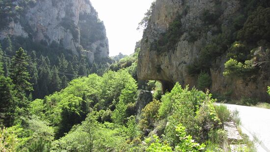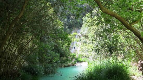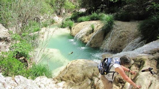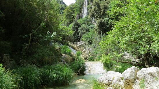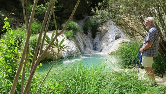 Das zweite ist dann die Schlucht mit dem Wasserfall von Polylimnio in Richtung Kalamata. Die Wasserfälle und der Bach mit seinem klaren Wasser bilden immer wieder malerische Becken, umgeben von üppigem Grün. Licht, Schatten, Sonnenstrahlen und das Wasser ergeben zusammen eine unvergessliche Athmosphäre. Die Klettertour über die Felsen und den Steilhang zum letzten Wasserfall, der bis zu 20 m herabstürzt, wird erleichtert durch Halte- und Tritteisen. Ein kleines Abenteuer. Der Abstieg war dann gar nicht so schwierig, wie zunächst erwartet.