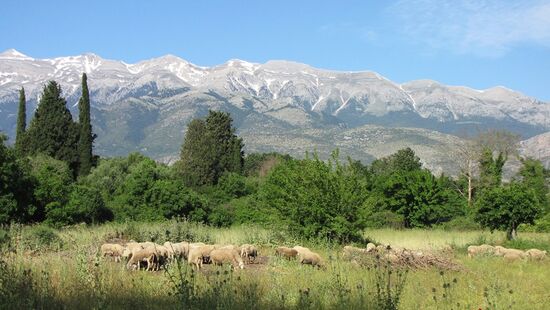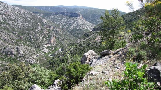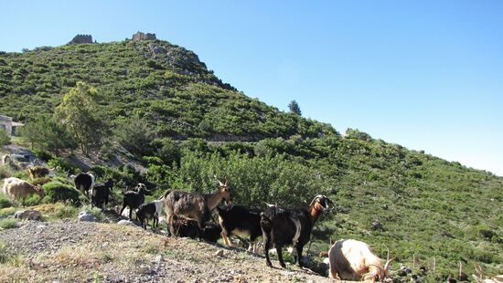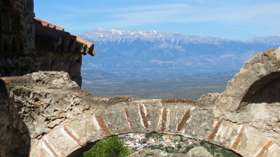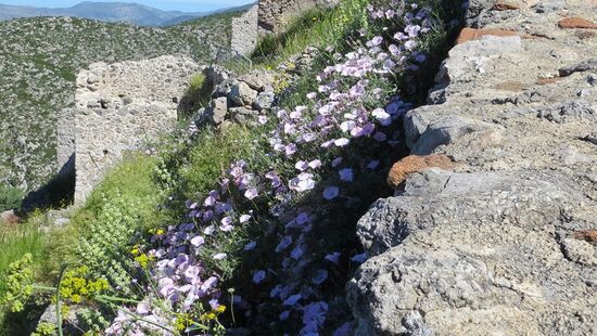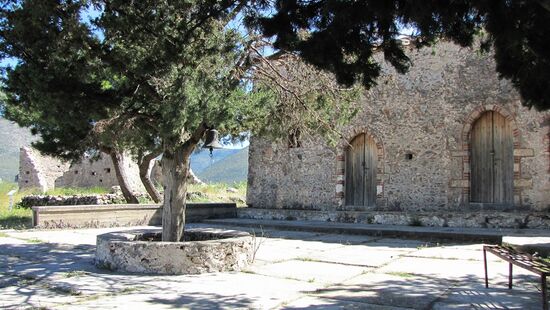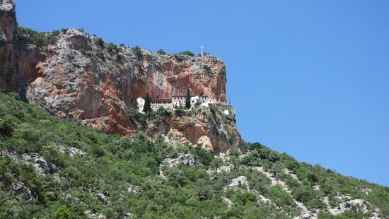 Von Geraki aus geht es weiter über Kosmas (ca. 1200 üNN) durch das Bergland über enge Serpentinen entlang tiefer Schluchten und vorbei an bemerkenswerten Felsabbrüchen und steilen Hängen nach Leonidio (ca. 40 üNN) Richtung Küste. Knapp 20 km vor Leonidio entdecken wir das Kloster Elonis (16. Jh.), das wie ein Schwalbennest am Felsen klebt. Blühender Ginster und Oleander säumen die Straße. Zum Ende hin erhascht man immer wieder einen Blick auf das Meer.