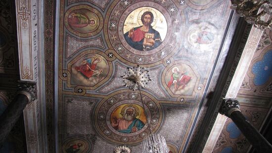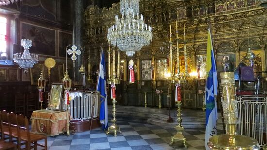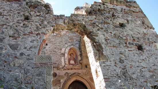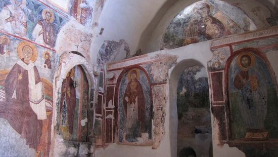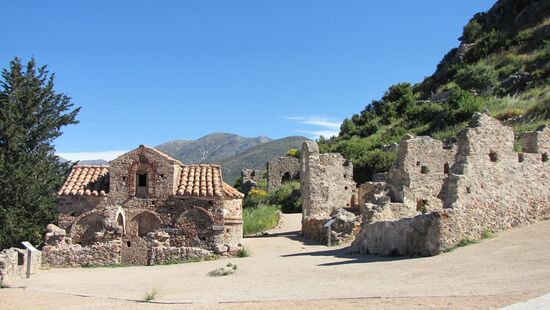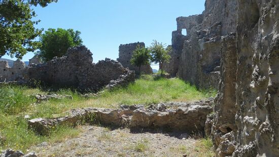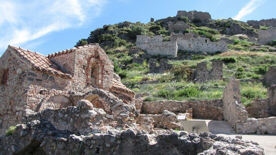Wir besichtigen die am Hang gelegene Anlage mit Ruinen bis hinauf zu den Resten der Festung, wobei die restaurierten Kirchen noch verschlossen sind. Wir sind rechtzeitig wieder zurück, um dann doch noch die Agia Paraskevi, eine hübsche kleine byzantinische Kirche aus dem 15. Jh. besichtigen zu können.