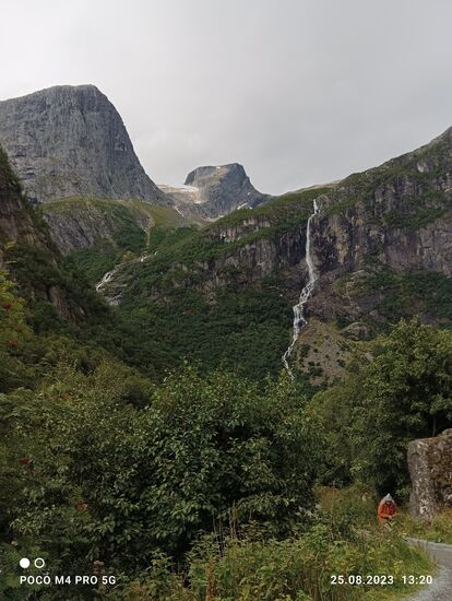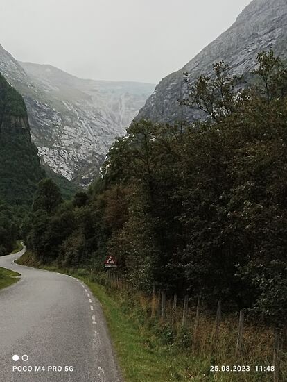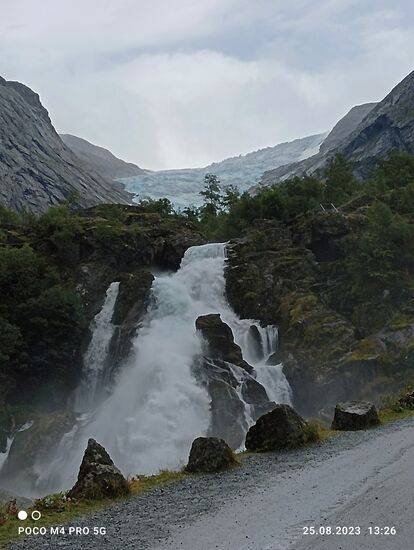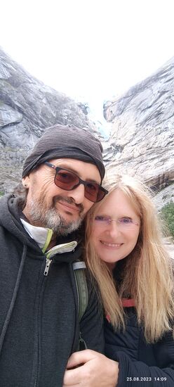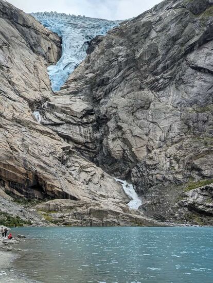 Wir sind dann auf der 15 weiter gefahren und haben durch Zufall einen schönen Stellplatz für die Nacht gefunden. Am nächsten Tag wollten wir dann zum Gletscher und zwar zum Briksdalsbreen einem kleineren Arm vom Jostedalsbreen. Wir waren einigermaßen früh da und fanden einen guten Platz zum Übernachten für umgerechnet 18,00 Euro die Nacht. Der Weg hoch zum Gletscher ist ein wenig mühsam aber nicht sonderlich schwer. Es gibt auch noch die Möglichkeit sich mit einem Trolli hochfahren zu lassen, was auch gut genutzt wurde. Oben hat man ein gefühlt von Karibik - der Strand, glasklares blaues Wasser bei herrlichsten Sonnenschein und den Blick auf den Gletscher.