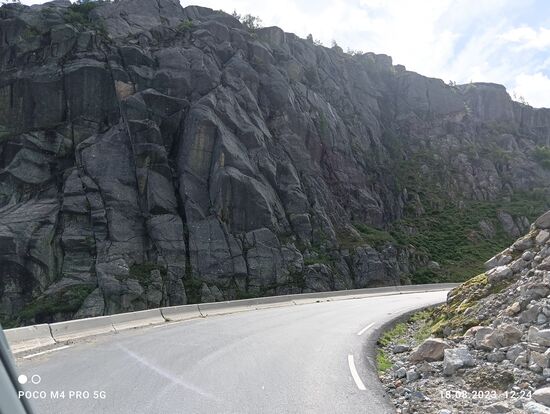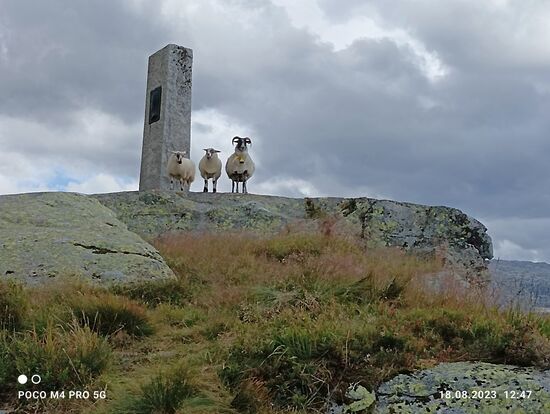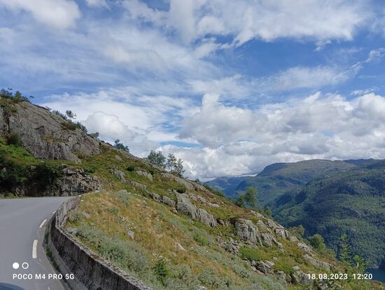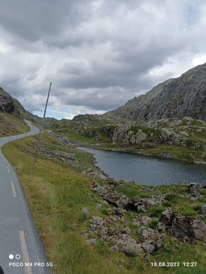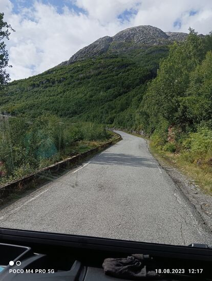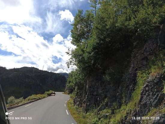 Nach zwei Tagen verlassen wir unseren Stellplatz und unser Ziel ist die Nationalroute Hardangervidda. Zunächst folgen wir der E134 um dann hinter Roldal die 520 Richtung Sauda zu nehmen. Eine grandiose Landschaft wartet auf uns - mit Worten kaum zu beschreiben. Die Straße ist eng aber den Scharfen auf der Seite und auf der Fahrbahn ist das egal, die bleiben einfach liegen, so das man schon mal aussteigen muss um sich ein wenig Platz für die Weiterfahrt zu schaffen. Eigentlich hatten wir vor nach Odda zu fahren aber da wir auf die 520 abgebogen waren, ging es jetzt runter Richtung Haugesund. Wir sind dann irgendwo bei Ölen wieder auf die E134 und dann wieder hoch zur ursprünglichen Route Richtung Odda.