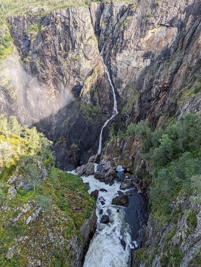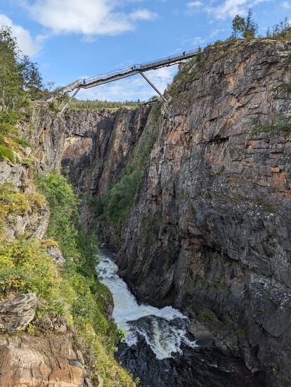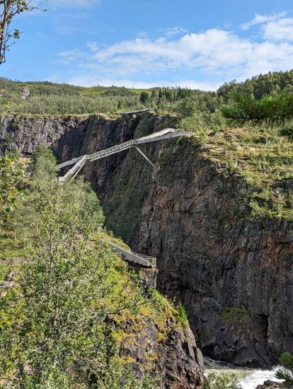 Wieder zurück auf unsere geplante Tour ging es jetzt zum Voringfossen. Uns interessierte die Brücke über die Schlucht und wir wurden nicht enttäuscht. Wir kamen an bei herrlichem Wetter und toller Sicht. Eine Stunde später lag alles im dichten Nebel - wie von Geisterhand, eine unheimliche Atmosphäre . Wir gingen zurück zum Auto und fuhren weiter zu unserem nächsten Stellplatz für die Nacht. Unser nächstes Ziel war Lillehammer.