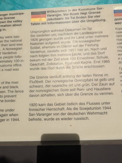 Nur wenige Meter auf der anderen Seite der Straße fließt der Fluss Jakobselva bis in die Barentsee. Die Mitte des Flusses dient als Grenze - auf der anderen Seite ist bereits Russland.