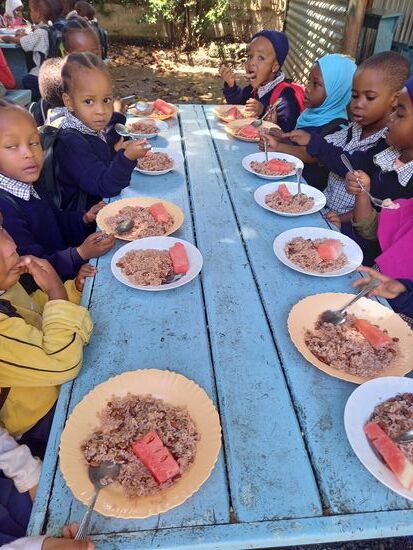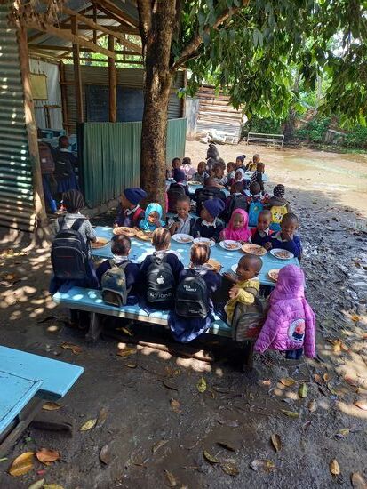 Inzwischen sind auch Kinder aus der Nachbarschaft eingetroffen, es hat sich herumgesprochen das es heute leckeres Essen gibt. Hähnchen gibt es nur selten. Als ich anschließend meine Haribo auspacke, leuchten die Augen noch mehr.