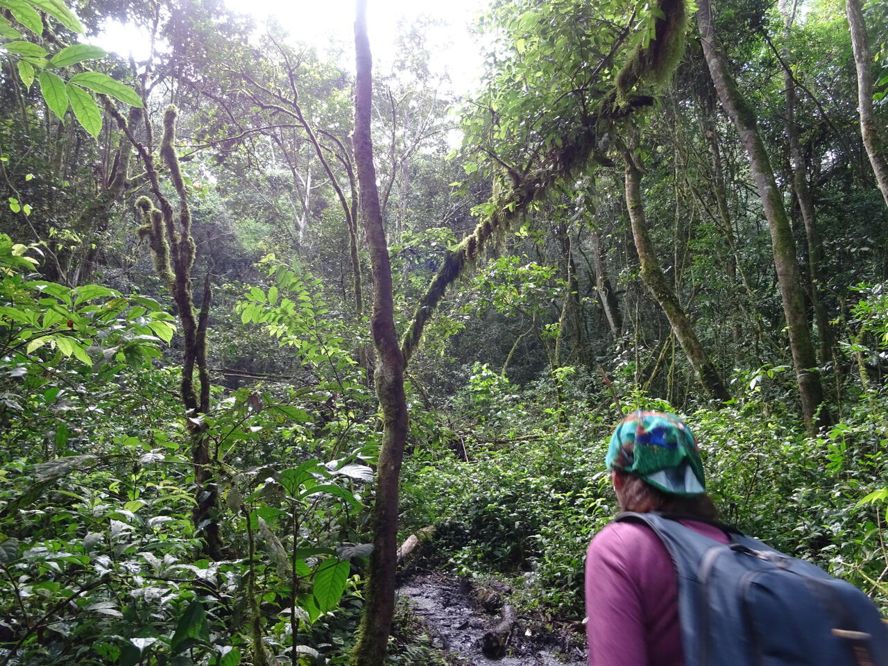 Florence stoppt immer wieder und horcht in den Dschungel hinein, um vielleicht die Rufe der Schimpansen zu hören. Denn es gibt natürlich keinerlei Garantie, das wir tatsächlich Schimpansen sehen werden.
