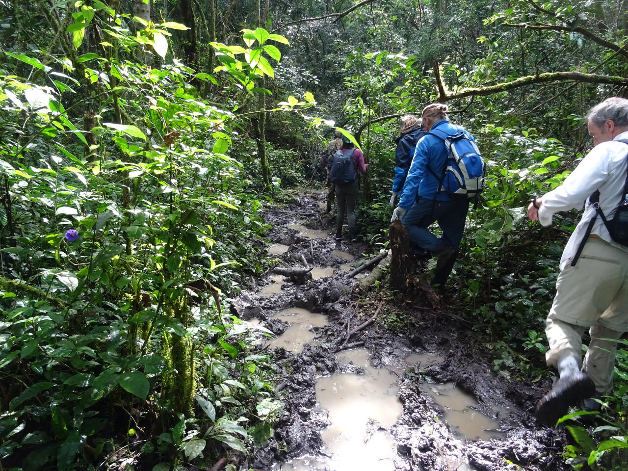 Der Boden ist total matschig. Da sind Trekkingschuhe unbedingt notwendig. Es ist extrem rutschig. Man muss auch vorsichtig sein, wonach man greift, denn einige Pflanzen haben große Dornen. Wir haben extra schnittfeste Handschuhe angezogen.