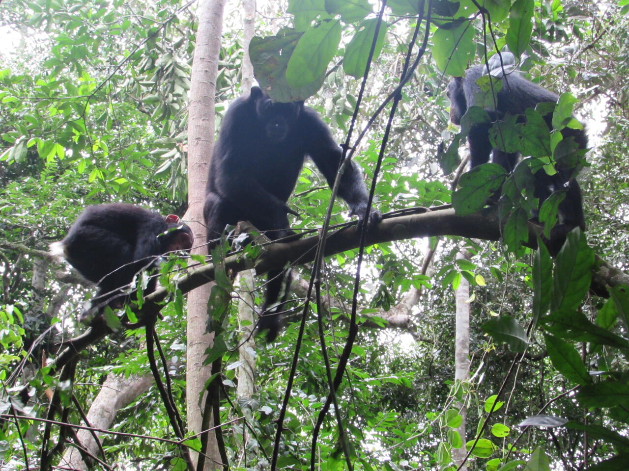 Schließlich sehen wir die ersten Schimpansen hoch oben in den Bäumen. Wir haben sie relativ schnell gefunden, denn wir siind gerade eine Stunde unterwegs.