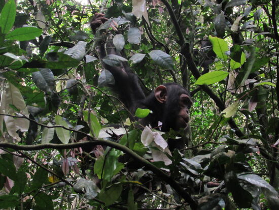 Dann hören wir die aufgeregten Schreie der Schimpansen. Die Guides vermuten, das sie wegen der Elefanten in Aufregung sind. Wir folgen den Rufen.