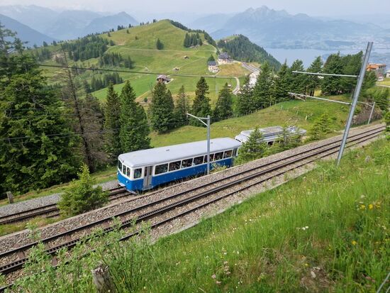 Am nächsten Tag unternehmen wir einen Ausflug auf die Rigi, den Tipp hatten wir von unserem Gastgeber. Wir fahren vom Bahnhof Mattenhof in Kriens mit der Bahn nach Luzern, per Gästekarte sogar kostenlos. Dort erwerben wir ein kombiniertes Schiffs- und Rigi-Wanderticket für 60 CHF pro Person. Mit dem Schiff geht es auf dem Vierwaldstättersee nach Vitznau. Dort steigen wir in die Rigi-Zahnradbahn bis Rigi-Kulm um. Kurz vor dem Gipfel ertönt in der Bahn das sehr populäre "Rigilied", das der Rigi als "Königin der Berge" gewidmet ist.