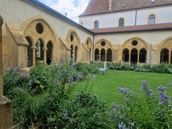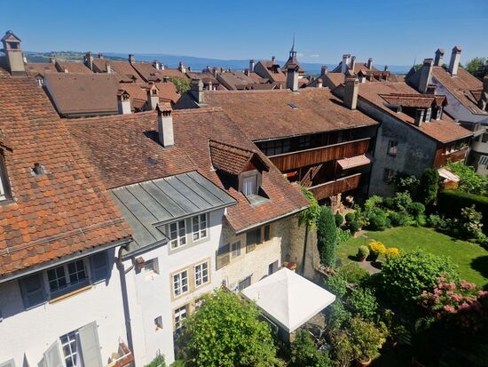 Der Wochenmarkt hat nur zwei Stände, einer davon mit interessanten "Moos-Blumentöpfen". Von der Stadtmauer hat man einen schönen Blick über die Dächer der Stadt. Einen kleinen Murtener Rahmkuchen (eine lokale Spezialität) nehmen wir auch mit.