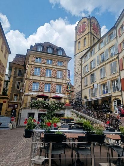Am letzten Tag unseres Aufenthalts im Dreiseenland fahren wir nach Neuchatel (Neuenburg) und parken dort am Parking de Piscines. Am Seeufer gehen wir bis zum Place Pury, dann die Hauptgeschäftsstraße Rue du Seyon entlang.