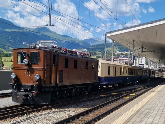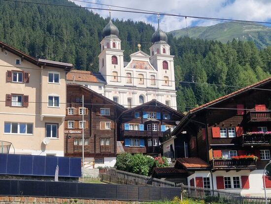 Auf dem weiteren Weg halten wir in Disentis, wo es ein Kloster und einen historischen Zug auf dem Bahnhof zu sehen gibt.