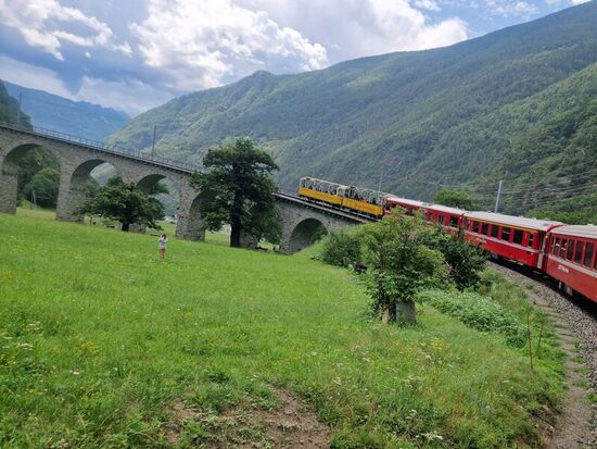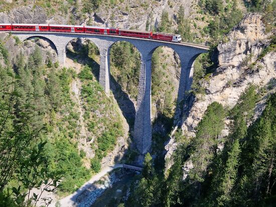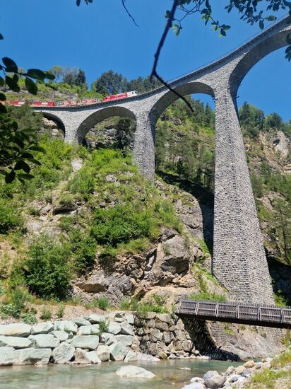 Am nächsten Morgen ist sehr heißes Wetter angekündigt, da fahren wir lieber in die Berge. Zuerst geht es zum Landwasser-Viadukt bei Filisur. Zunächst wandern wir hier zur Aussichtsplattform Süd, wo wir drei Züge sehen.