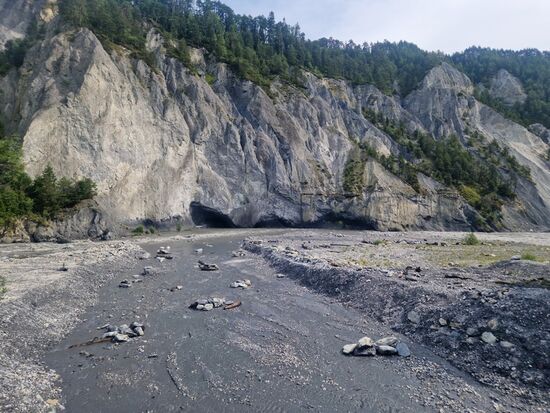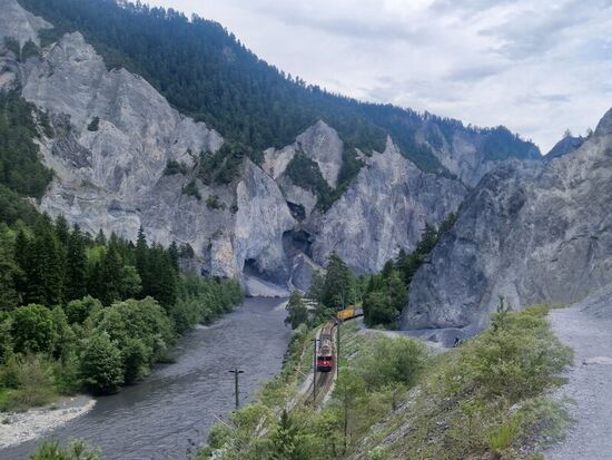 Einen Tag später ist es nicht mehr so heiß, da wollen wir die Rheinschlucht erkunden. Wir fahren mit der Bahn nach Valendas-Sagogn. Von hier führt der Weg mit imposanten Ausblicken zum Bahnhof Versam-Safien. Hier gehen wir noch ein Stück die Schlucht entlang, dann wieder zurück (der Talweg endet hier).